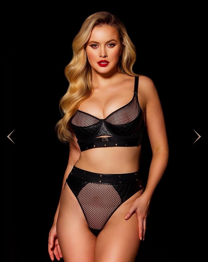 Linda C is back in a lustrous black. The collection features soft elastics, glossy gold hardware, and smooth micro-knit. Made with a lining of sheer crystal tulle, this strappy siren is designed to frame the silhouette and create killer curves. With a daring attitude that’s not-so-innocent, this black bondage set shows very little restraint.