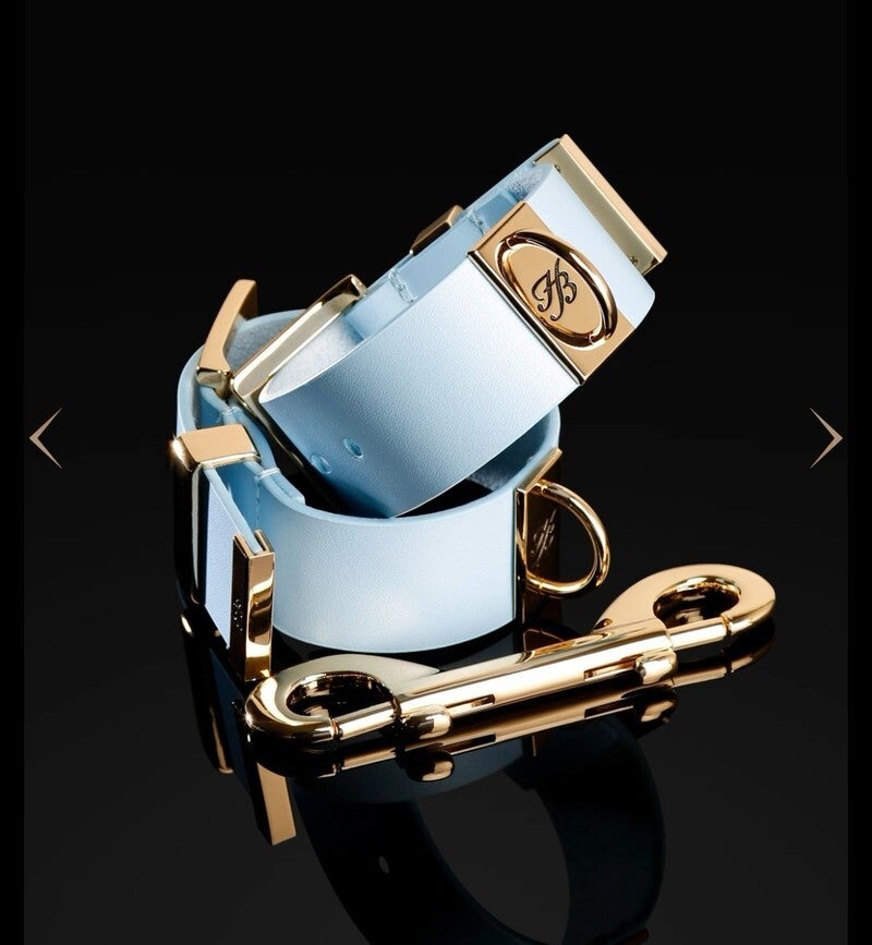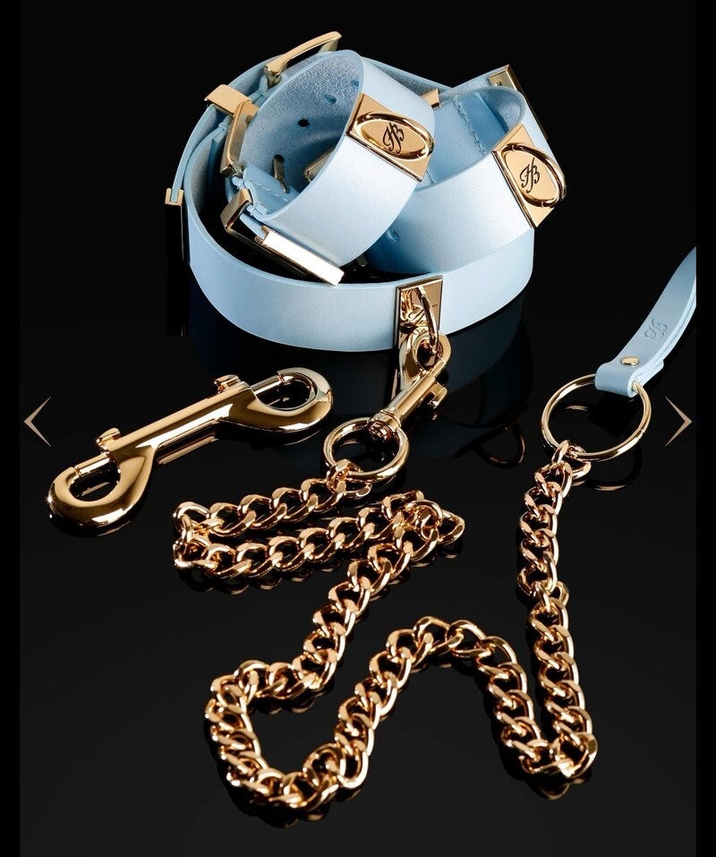 Bound by blue leather and decadent gold hardware, this luxe bondage kit will bring your fantasies to life. This dreamy little set includes a pair of cuffs, matching collar, fastening clip, and a long draping chain.