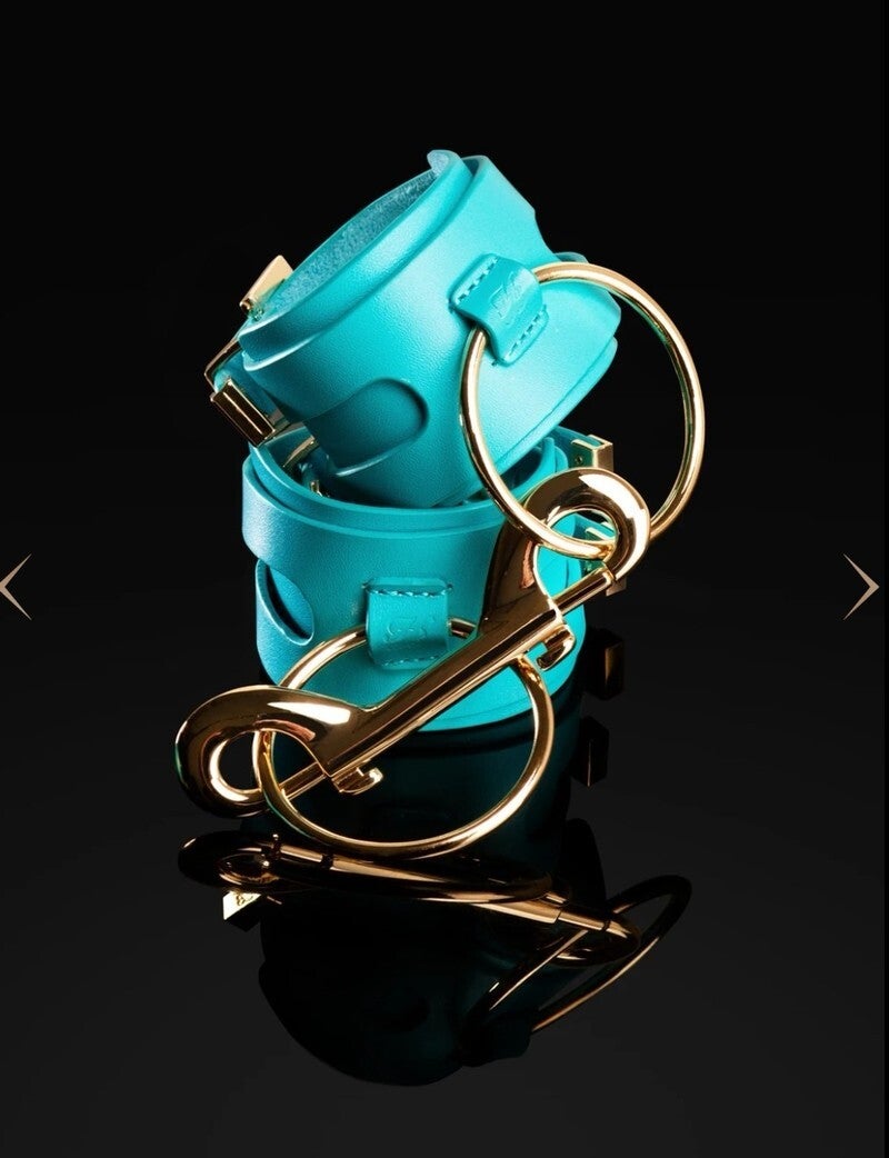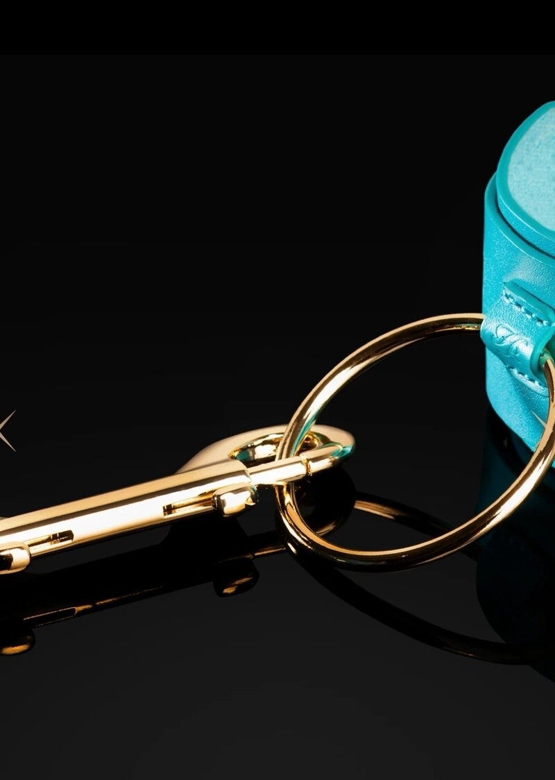 Divine blue bondage is a connoisseur’s delight! Designed with exaggerated O rings for advanced play, this three-piece collector’s kit includes a two-way clasp that adds strength and resilience amidst the throes of passion. Crafted with premium stitching, polished gold hardware, and a smooth suede lining, these tempting turquoise cuffs are bound to please.